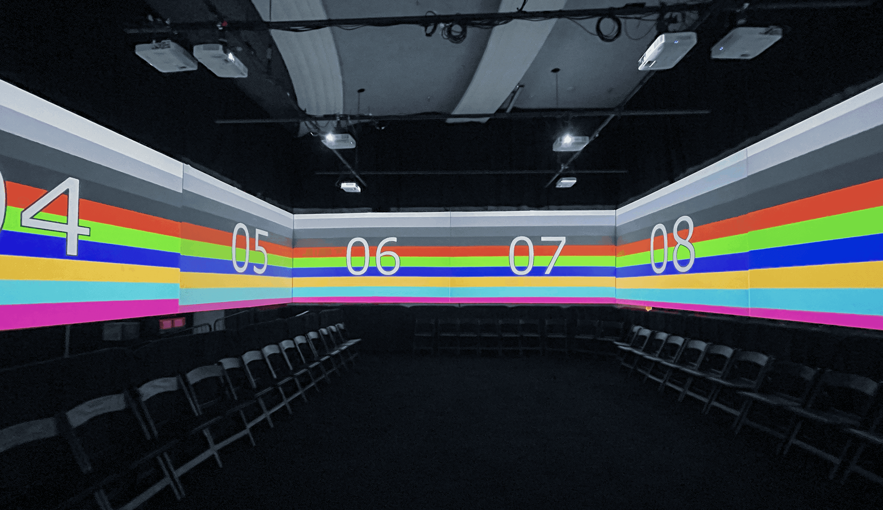 Projection calibration in the CineChamber array at Gray Area, San Francisco, aligning ten synchronized projectors into seamless 360° coverage.