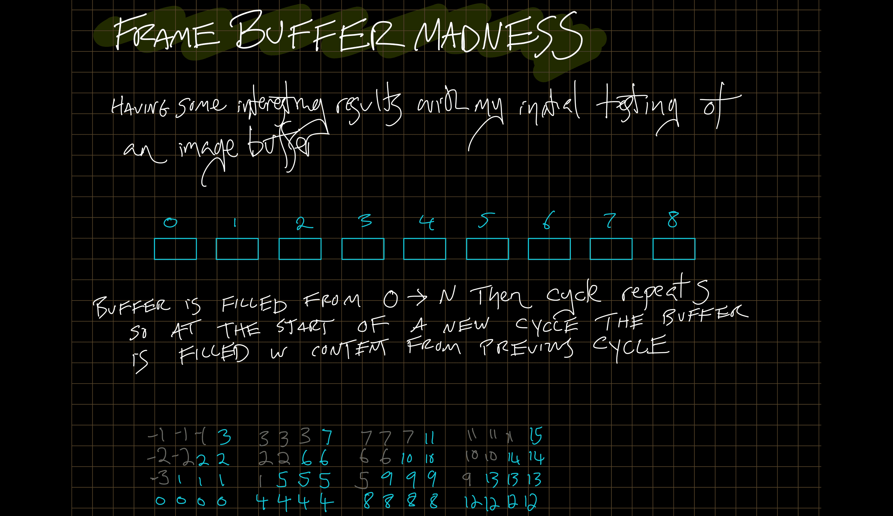 The DeepDream Vision Quest installation code was written in Python 2.6, using OpenCV for live video capture and NumPy arrays as image buffers. I already knew how to grab frames from the webcam, store them, and transform them. The challenge was figuring out how to turn that memory into something that felt alive and continuous, not just a frozen snapshot of the last person who walked by. I sketched grids of frames to work out how new frames replaced old ones, how the buffer wrapped around, and how playback could start anywhere in the sequence.