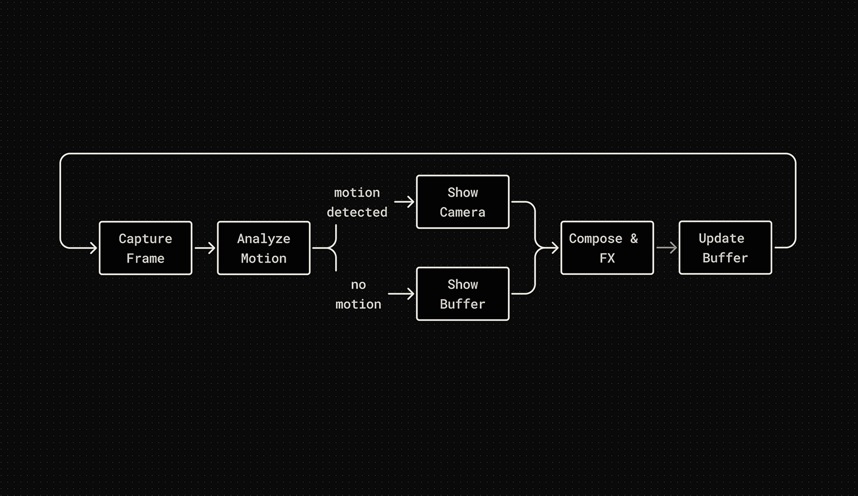 By counting pixel deltas between webcam frames, the pipeline transitions between the raw camera feed and DeepDream processing, allowing users to enter the hallucination simply by holding still.